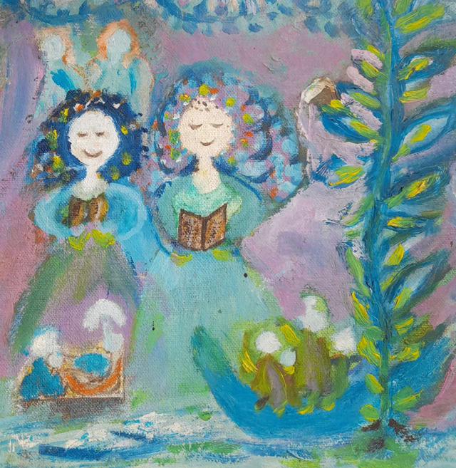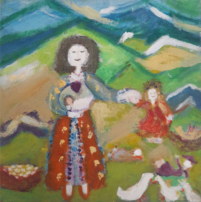 La muestra está conformada por cuatro grupos o series de cuadros, titulados: “Maternidad”, “Mujeres del campo”, “De la Forma al Color” y “Ángeles y Sueños”.