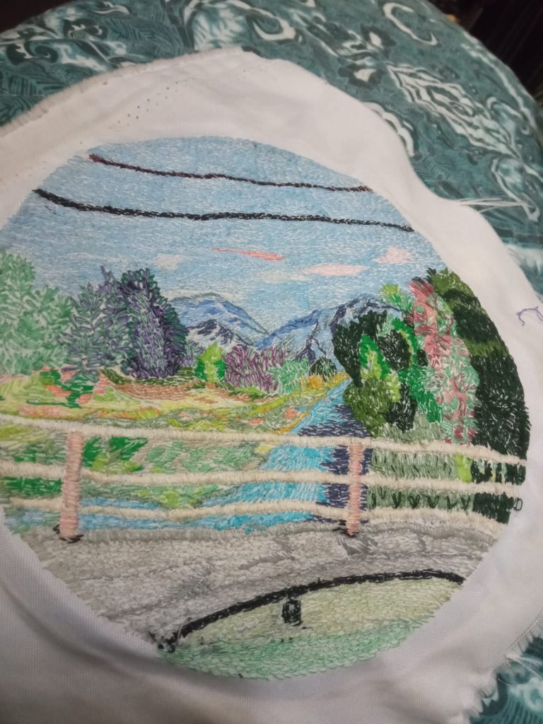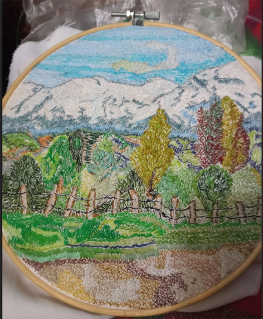 Las dos últimas semanas del mes podrán apreciarse los paisajes bordados de Ruth Gaete, quien fuera profesora de cientos de niños y jóvenes en colegios de Paine y Buin. “Entre colores y puntadas: Bordado Paine”, se llama la muestra.