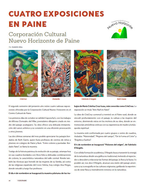 El segundo semestre del presente año reúne cuatro valiosas exposiciones ofrecidas por la Corporación Cultural Nuevo Horizonte en el Centro Cultural de Paine.